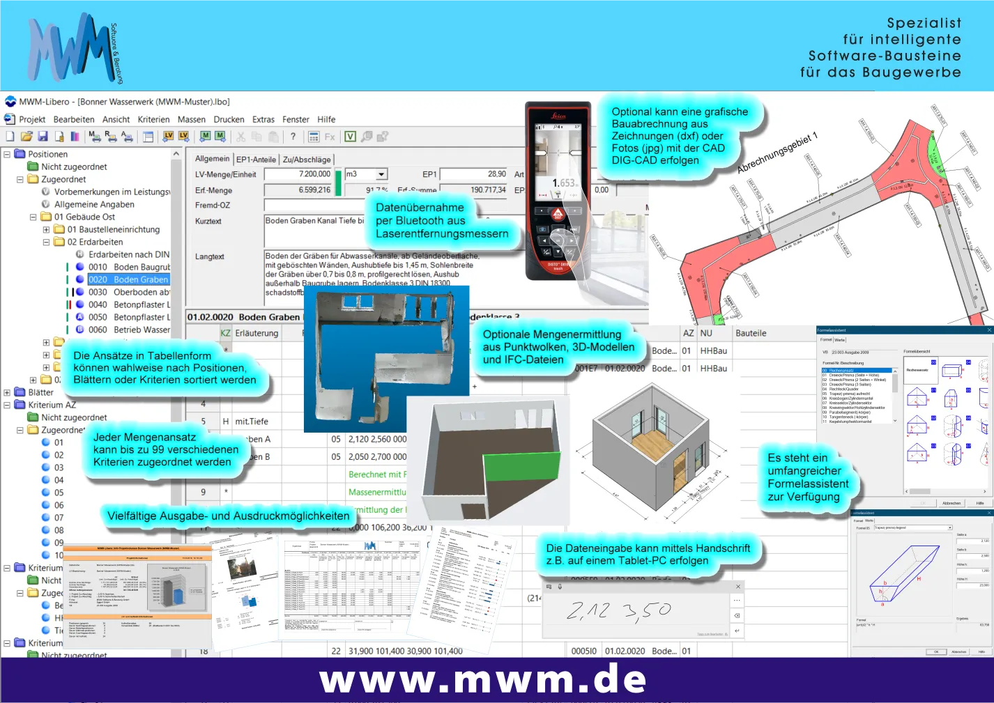 18 Jahre vor der Einführung vom iPAD hat MWM begonnen, für Tablet-Computer ein mobiles Aufmaß zu entwickeln. Die ersten Bluetooth-Entfernungsmesser wurden an MWM-Libero angeschlossen und lange vor dem kommerziellen Einsatz von Fluggeräten hat MWM auf einer Messe einen Quadrocopter vorgestellt, um Mengen aus Luftbildern zu ermitteln. MWM erkennt oft Innovationen vor dem Markt und führt rechtzeitig entsprechende Entwicklungen durch.